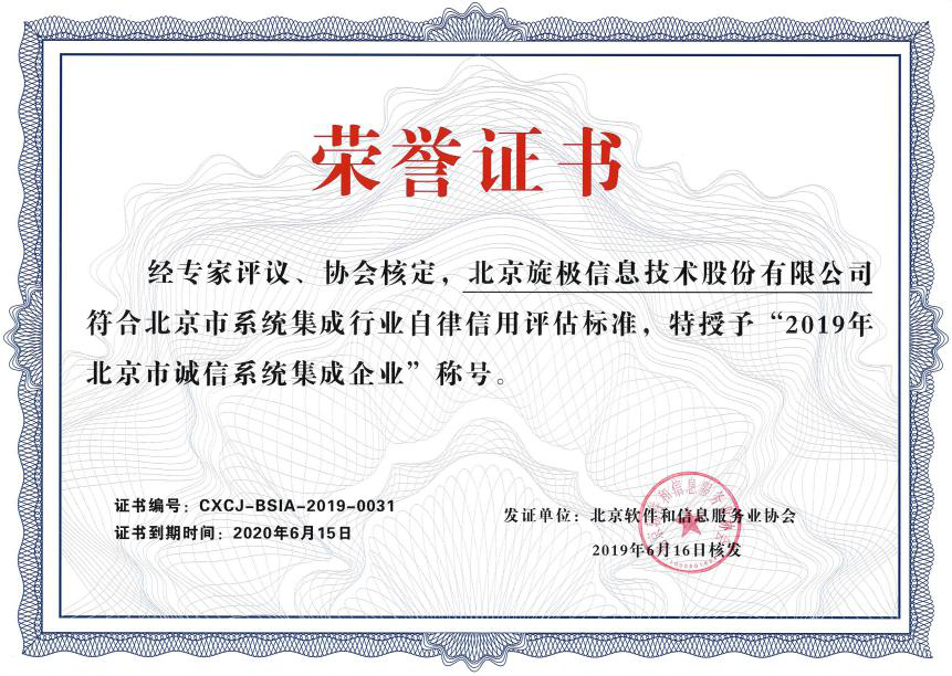 日前,由北京市经济和信息化局、北京市社会团体管理办公室指导,北京软件和信息服务业协会组织召开的行业自律信用评估活动圆满落下帷幕,北京K8凯发国际信息技术股份有限公司(以下简称“K8凯发国际信息”)荣膺“2019年北京市诚信系统集成企业”称号。